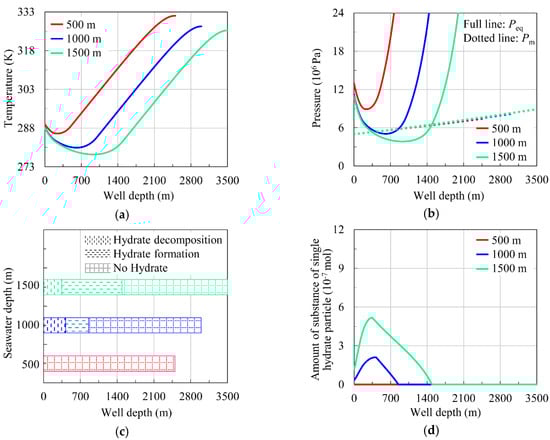 From Figure 9c,d, it can be seen that when other conditions are constant and the length of the well below the mud line is the same, with increased seawater depth (from 500 m to 1500 m), the hydrate formation region in the wellbore and the amount of substance of single hydrate particle increase, which makes it easier to block the wellbore and even harder to keep the safety of production.