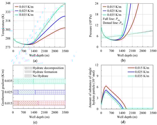 From Figure 10c, it can be seen that when the geothermal gradient is 0.015 K/m, the hydrate formation region is from 1702 m to 348 m and the hydrate decomposition region is from 348 m to 0 m. When the geothermal gradient is 0.025 K/m, the hydrate formation region is from 1492 m to 348 m and the hydrate decomposition region is from 348 m to 0 m. When the geothermal gradient is 0.035 K/m, the hydrate formation region is from 1383 m to 348 m and the hydrate decomposition region is from 348 m to 0 m.