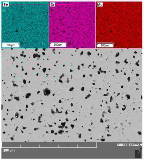 The SEM image processing analysis by the ImageJ program indicated that the porosity of SFM was about 8%. An increase in the sintering time did not lead to a significant change in the porosity. An increase in the sintering temperature by 50 °C led to the melting of the material. The energy dispersive X-ray analysis revealed a homogeneous distribution of Fe, Sr, and Mo cations on the surface layer of SFM (Figure 1).