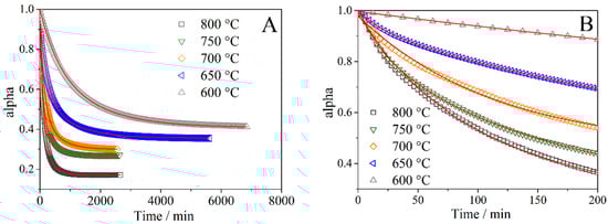 The dependence of the 18O oxygen isotope fraction in the gas phase (alpha) on the time at PO2 = 10−2 atm. (A) and fragment of the dependence of the initial section (B).