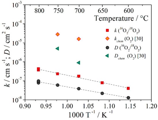 Figure 3 shows the temperature dependence of the oxygen exchange and diffusion coefficients for SFM oxide at an oxygen pressure of Po2 = 10−2 atm. The results are given in comparison with the data from [] for SFM.