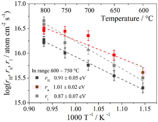 Temperature dependence of the oxygen heterogeneous exchange rate (rH), oxygen adsorption rate (ra), and oxygen incorporation rate (ri) of Sr2Fe1.5Mo0.5O6−δ oxide at Po2 = 10−2 atm.