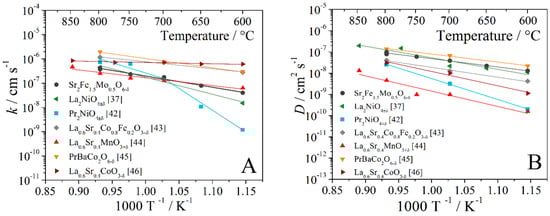 The temperature dependences of the oxygen surface exchange and diffusion coefficients for different oxides are shown in Figure 6. In these graphs, the oxide materials with perovskite and Ruddlesden–Popper structures were selected as analogues for SFM that could be used as cathode materials in electrochemical devices. The values of the oxygen surface exchange coefficients of strontium ferrite-molybdate were commensurate with La0.6Sr0.4MnO3+δ oxide. High values of the oxygen diffusion coefficients for Sr2Fe1.5Mo0.5O6−δ oxide were obtained; these values were comparable to the values for praseodymium-barium double cobaltite and exceeded the lanthanum-strontium manganite by more than an order of magnitude.
