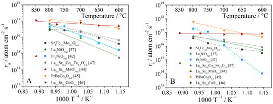 The dependences of the dissociative adsorption and oxygen incorporation rates of some oxides are shown in Figure 7. The values are quite low compared to the rates of identical materials, but overall they are at a good level. The rates of strontium ferrite-molybdate are similar in magnitude to those of cobaltite-ferrite, which is two orders of magnitude higher than the values for lanthanum-strontium manganite.