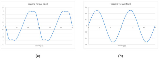 Cogging torque for a 1.4 kW machine with: (a) Q = 12, p = 4, τ = 30°; (b) Q = 12, p = 10, τ = 6°.