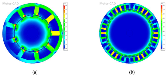 The fourth requirement, i.e., a null unbalance in the electromagnetic force, can be achieved by the presence of a “symmetry” in the winding. For example, by considering two double-layer windings, the first one with Q = 9 and p = 10, and the second one with Q = 36 and p = 40, we can observe that the latter presents a lower torque ripple and a null unbalance in the electromagnetic force, contrarily to the first one. In Figure 3, the flux density distribution at no-load for the same machine with two different windings is shown. Note that the range of the flux density is comprised between almost zero (blue color) and 1.7 T (red color).
