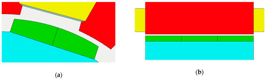 The behavior of the motor with different types of wedges was simulated using two FE software, Motor-CAD and FLUX 2D (2018 version, Altair Engineering Inc., USA). Initially, Motor-CAD was used because the original motor, with standard non-magnetic wedges, was modelled with this software and validated by the company with experimental measurements. Therefore, it is reasonable that the simulations implemented with this model, varying the characteristics of the wedges, are reliable. In addition, this software takes little time to get results from simulations. However, some calculations require FLUX 2D, in particular for the spectrum analysis function, which provides the harmonics of any quantity, e.g., the airgap flux density. The distribution of the fractional-slot concentrated winding of the motor was calculated automatically with Motor-CAD, as shown in Figure 11a. The magnets are not segmented radially, but axially, as displayed in Figure 11b: Each pole comprises a series of 12 magnets, in order to reduce losses in the magnets due to eddy currents and to facilitate the assembly.