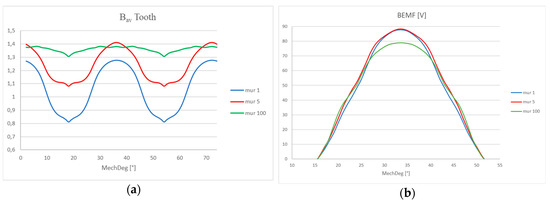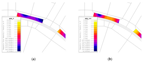 Apparently, wedges with μr = 100 seem to guarantee higher flux linkage and BEMF, due to the higher average flux density in the tooth. However, this higher average flux density in the tooth is due to the large values of the flux density reached in the polar shoe. From here, a part of the flux lines is deviated by the wedge with higher permeability, increasing the leakage flux. If the polar shoe is neglected, the average flux density in the top of the tooth is slightly higher with the wedge with μr = 5. This result confirms the higher BEMF obtained with μr = 5, as shown in Figure 7b.