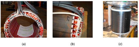 SPM motor: (a) wound stator; (b) stator end-windings; (c) carbon fiber covered rotor.