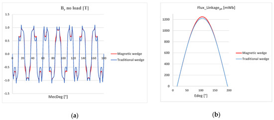 Figure 12a shows the radial component of the airgap flux density under no load, both in the case of the traditional wedge and the magnetic wedge. It can be noted that the flux density is slightly less irregular in the case of a magnetic wedge and its rms value is greater than in the traditional wedge (Br = 0.762 T instead of Br = 0.738 T). The flux linkage also increases, as in Figure 12b, causing a slight increase of the rms value of BEMF (+1.34%) and the maximum value of the flux density in the tooth (from 1.726 to 1.759 T, increase of 1.88%.