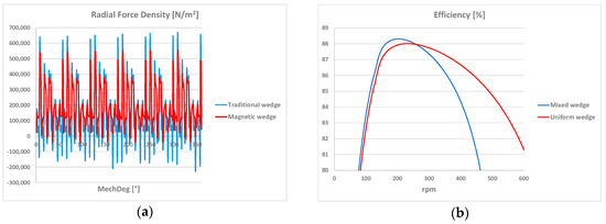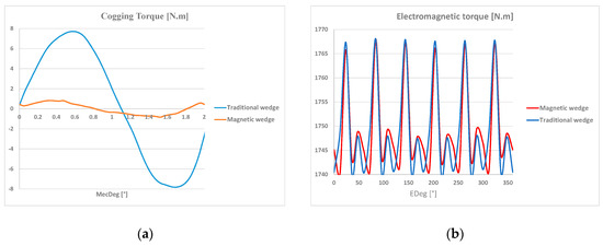 In order to evaluate the effect of magnetic wedges on the behavior of the machine at full load, a comparison was made with traditional wedges on an equal value of the electromagnetic torque (1749 Nm), calculated by means of FE analysis with Motor-CAD, to correctly compare the losses. The average torque over an electrical period remains constant; however, in the two cases, there is a different ripple, as in Figure 13b. The magnetic wedge allows a slight reduction of 0.18%, from 1.89% to 1.71%. This result is obtained with a small increase of the line current (from 46.50 to 46.95 A), also due to a slight reduction of the power factor (from to 0.88 to 0.87).