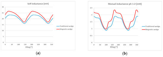 At full load, the magnetic wedges provide an increase in self-inductance, due to the reduction in the reluctance of the magnetic circuit. Its average value rises by only 10.7%, both for the not very high permeability of the wedge and for the saturation present in some parts of the machine, as in Figure 14a. The mutual inductance also increases, by about 20%, as in Figure 14b, however, its absolute values remain low and do not cause any problem. Due to the saturation phenomena, the fully loaded machine behaves as not perfectly isotropic from the magnetic point of view. The inductance along the d axis increases as well and the flux linkage along the d axis decreases (Table 4).