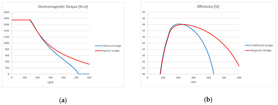 With intermediate load percentages, magnetic wedges offer greater advantages, since the losses are proportionally similar to those in the absence of load. The behavior of the machine was also assessed in field weakening area, for currents equal to the nominal one. As displayed in Figure 15a, at 500 rpm, the torque is zero with traditional wedges while with magnetic wedges, the machine is still able to provide a torque equal to 0.26 p.u. (456 N·m). This difference not negligible. Figure 15b underlines that, although at the rated speed the performance of the machine is better with the standard wedges, its behavior changes for a speed greater than 230 rpm. The magnetic wedges provide an efficiency greater than 80% even at 600 rpm while with traditional wedges, the efficiency drops below this threshold, starting from 440 rpm. It is clear that magnetic wedges offer greater flexibility in these working conditions.