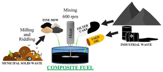 A well-tested technique was used to prepare fuel slurries [30]. MSW (cardboard, wood, rubber, and plastic) was ground separately and sieved through a sifter (mesh size of 140 µm according to ISO 3310:2000). Different compositions were obtained by mixing wet FC, MSW, and oil (Figure 1) with the component concentration presented in Table 2. A DC-600RM mixer (HT Machinery, Japan-Taiwan) and a steel vessel (volume of 0.2 L) were used. The basic compositions (Table 2) were also burned: No. 1—wet FC without any additives; No. 10—wet FC mixed with used turbine oil.