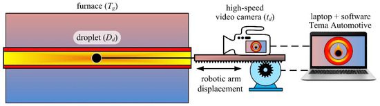 The fuel ignition and combustion characteristics were investigated using an experimental setup (Figure 2) [30], featuring a Loiplf50/500–1200 (Laboratory Equipment&Instruments, Russia) tube muffle furnace with diameter and length of the tube at 50 mm and 500 mm, respectively, and the temperature variation range at 20–1200 °C. In each set of experiments, the furnace was preheated to a given temperature. After temperature stabilization, a fuel droplet (Dd = 2 mm) was introduced into the furnace along the symmetry axis of the ceramic tube. The processes were recorded by a Phantom V411 (Vision Research, USA) high-speed color video camera with a maximum filming rate of 4200 fps at resolution 1280 × 800 pixels. The values of ignition delay times (td) were calculated by Tema Automotive software (Image Systems AB, Sweden) that analyze the evolution of the droplet luminance over time [29,30]. The systematic error when calculating td did not exceed 3%. Random errors for sets of 5–7 experiments under identical conditions were no more than 10%.