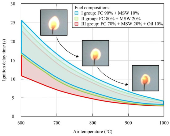 In Figure 3, the maximum ignition delay times (the curve demarcating the blue area above for group I of fuel compositions) correspond to td of composition No. 1 (wet FC). Fuel composition No. 12 (FC 70% + cardboard 20% + oil 10%) has the lowest ignition delay times in the range of Tg = 600–1000 °C (the curve demarcating the red area below for group III of fuel compositions). For other compositions under study, the td values lie in between these two curves. The fuel compositions have been sorted in descending order in accordance with their ignition delay times: group I—FC 90% + MSW 10%; group II—FC 80% + MSW 20%; and group III—FC 70% + MSW 20% + oil 10%. Thus, the latter compositions have the lowest ignition delay times. Adding 10% of MSW to the FC, increasing MSW content to 20%, and adding 10% of used oil lead to a decrease in the ignition delay time (Figure 3). It can be explained by lower moisture concentration (chemically inert and heat-absorbing component at the initial stage of the induction period) in the fuel slurry containing MSW, as compared with composition No. 1. Another reason for enhanced ignition is the presence of combustible liquid (used oil) in the fuel slurry.