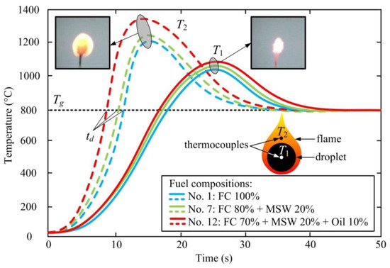 In Figure 4, the points of intersection of the corresponding dashed curves with a line at Tg = 800 °C correspond to the ignition moment (td) of different fuel compositions. The heat input at t = td in the area of rapid exothermic reaction (ignition zone) exceeds the heat outflow from this area into the environment. During the burnout of the gaseous mixture, the maximum values of T2 reach 1300 °C for group III of the fuel compositions with used oil. The maximum droplet temperatures T1 for different fuel compositions have similar values and do not exceed 1150 °C (Figure 4). Under the heterogeneous combustion conditions, the droplet burns out layer by layer. The process duration from the gas-phase ignition moment up to the solid residue burnout at Tg = 600–1000 °C is 15–35 s (Figure 4) for droplets of 2 mm in diameter.