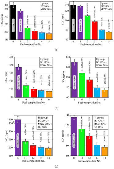 The MSW fuel components we added to the FC have been sorted in descending order (according to the NOx and SOx concentrations in combustion products (Figure 5)): rubber, cardboard, wood, and plastic. The content of nitrogen and sulfur in MSW is 2–10 times as low as that in the initial FC according to the element composition of the fuel components (Table 4). Thus, in the preparation of groups I and II of fuel compositions, the mass fraction of FC is reduced because a solid combustible component is added (cardboard, plastic, rubber, and wood) with lower nitrogen and sulfur content. Consequently, as a result of burning such fuel compositions in the conditions identical to the combustion conditions of composition No. 1 (wet FC 100%), the concentration of NOx and SOx decreases (Figure 5a,b). The concentrations of these anthropogenic emissions are 5–10% lower for the compositions with 20% of MSW (group II) than they are for the compositions with 10% of MSW (group I).