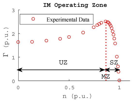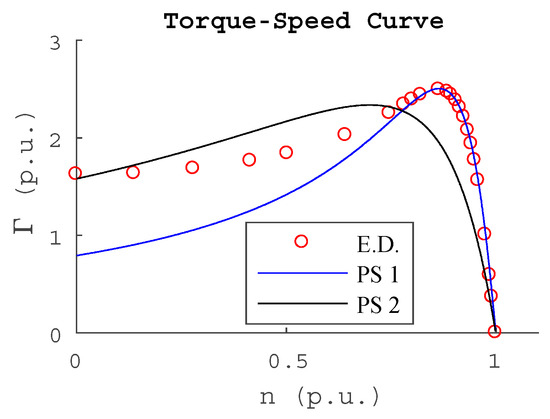 Figure 2 shows 23 points of the Experimental Data (E.D.) of an IM and two torque–speed curves generated with two different sets of parameters of the SC model, Parameter Set 1 (PS 1) and Parameter Set 2 (PS 2), with similar calculated errors, but with a very different fitting compared to E.D. In this case, the set PS 1 generates a behavior that is very fitted to the stable zone (SZ) compared to the PS 2 set but poor fitting in the unstable zone (UZ).