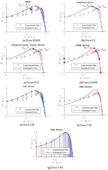 The seven error functions are the RMSE, CE, proportional curve error (PCE), maximum start points error and synchronism (MSS), linear sum error (LSE), taxi error (TXE), and trapeze area error (TAE). The last five were designed or modified from existing functions for the specific application to the induction motor.