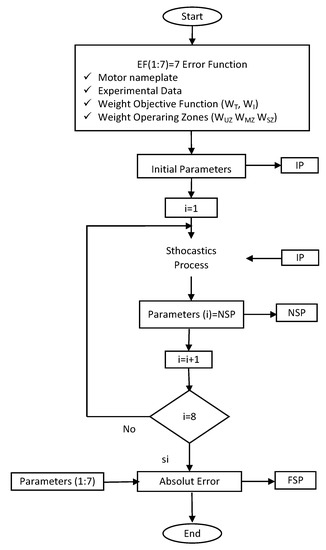The stochastic search technique with deterministic constraints (SSVDC) technique was designed and implemented in software, which includes a stochastic search process designed to estimate the constant parameters of the IM single cage model by adding four characteristics of the problem of the IM in the solution process: Multi-objective functions, weights for operating zones, seven error functions, and variable domain constraints. For this technique, a new strategy was designed to generate variable deterministic domain constraints in the SSVDC technique that ensured a correct convergence towards a set of parameters with the minimum possible error. The implementation is easy and does not require a definition of the probabilistic factors or parameters for its application.
