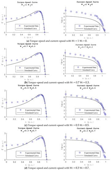 The algorithm was executed for 30 cases, which correspond to 5 distributions of torque and current weights: WT = 1 and WI = 0, WT = 0.3 and WI = 0.7, WT = 0.5 and WI = 0.5, WT = 0.7 and WI = 0.3, and WT = 1 and WI = 0, combined with six possible weight distributions of the operating zones.