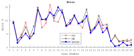 It is observed that the SSVDC technique obtains a smaller error in 21 of the 30 cases studied, that is, in 70% of the cases, the DE algorithm is 3%, and GA is 27%. All algorithms were executed with a maximum of 100 iterations. The average execution time of the GA algorithm was 54.1 s, DE was 59.2 s, and SSVDC was 61.8 s.