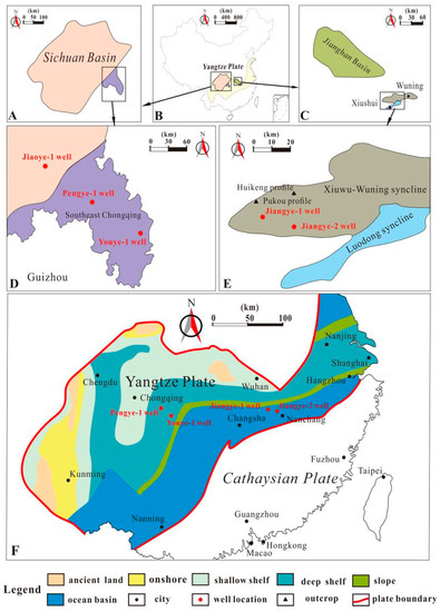 Geological maps of the research areas. (A,D) Geographical location maps of Southeast Chongqing. Pengye-1 and Youye-1 wells are located in this block, and Jiaoye-1 well is located in the Sichuan Basin. (B) Geographical location map showing Southeast Chongqing region in Upper Yangtze area and Xiuwu Basin in Lower Yangtze area. (C,E) Geographical location maps of Xiuwu Basin. Jiangye-1 and Jiangye-2 wells are located in this block, which is closest to the junction of the Yangtze and Cathaysian plates. (F) Map of sedimentary features of Yangtze plate in Early Cambrian.