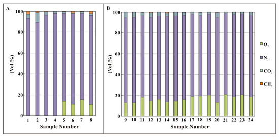Results of gas composition analysis: (A) Niutitang Formation gas samples from the Youye-1 well; (B) Wangyinpu and Guanyintang Formations gas samples from the Jiangye-1 well. The gas sample information can be seen in Table 1.