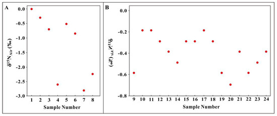 Results of nitrogen isotope analysis. (A) Niutitang Formation gas samples in the Youye-1 well; (B) Wangyinpu and Guanyintang Formations gas samples in the Jiangye-1 well. The gas sample information can be seen in Table 1.