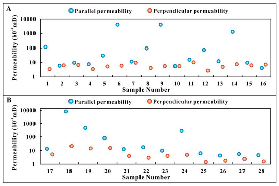 Parallel and perpendicular permeability scattergrams. (A) Samples of Wangyinpu and Guanyintang Formations shale from the Jiangye-1 and Jiangye-2 wells; (B) samples of Longmaxi Formation shale from the Pengye-1 well. The sample information can be seen in Table 2.