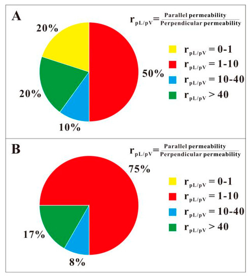Ratio statistics between parallel and perpendicular permeability. (A) Samples of Wangyinpu and Guanyintang Formations shale from the Jiangye-1 and Jiangye-2 wells; (B) samples of Longmaxi Formation shale from the Pengye-1 well. The sample information can be seen in Table 2.