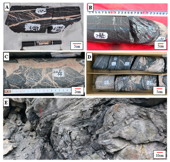 Detachment layers developed at the bottom of the Lower Cambrian in cores and field profiles in the Southeast Chongqing region and Xiuwu Basin. (A) Cores from the Niutitang Formation in the Youye-1 well, 3820 m; (B) cores from the Niutitang Formation in the Youye-1 well, 3827 m; (C) cores from the Wangyinpu Formation in the Jiangye-1 well, 2671 m; (D) cores from the Wangyinpu Formation in the Jiangye-2 well, 3130 m; (E) The Wangyinpu Formation in the Pukou profile. The well locations can be seen in Figure 1.