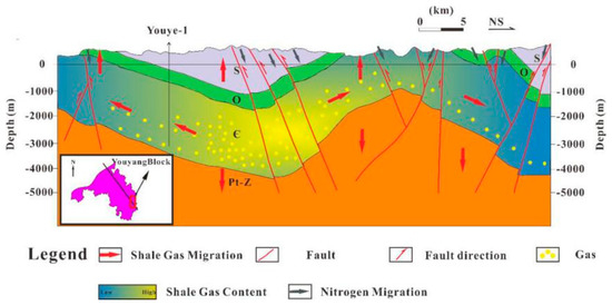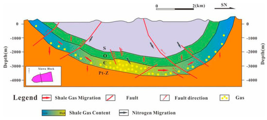 The development of fractures destroys the seal in the direction perpendicular to the horizontal plane, causing methane and other hydrocarbon gases to escape [41] and the entry of nitrogen from the atmosphere to target layer along the fractures [15]. The fault-opening events happened in the Late Cretaceous–Paleogene in the Xiuwu Basin, and the development of the deep faults in the Southeast Chongqing region accelerated these processes.