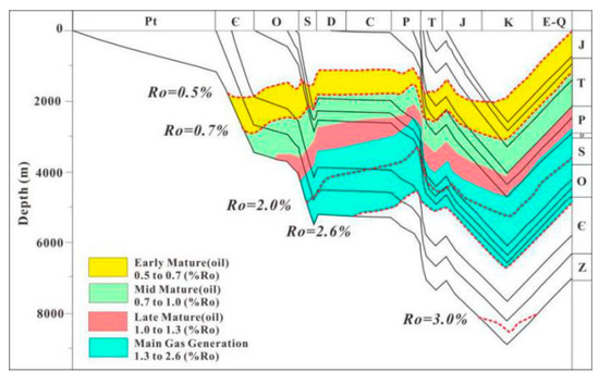 Because of the lack of vitrinite in the Lower Paleozoic, maturity evaluation is usually performed using the equivalent vitrinite reflectance (equal-Ro) calculated from asphalt reflectance [42]. According to the hydrocarbon generation history restored by Zhao et al., 2018 (Figure 9), the Niutitang Formation shale in the Southeast Chongqing region entered high mature stage in the Late Ordovician period [43]. In the Middle Silurian, the shale region entered the overmature stage (equal-Ro > 2.0%). Due to strata uplift, the maturity of organic matter no longer increased and equal-Ro of the shale eventually reached 3.13% to 3.49%, falling into the partial graphitization stage [44,45].