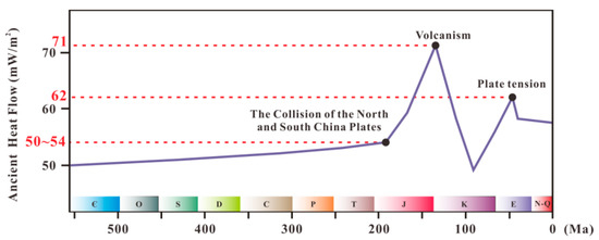 Krooss et al. (1995) concluded that nitrogen originating from the superdeep zone of crust and upper mantle zone is generally concentrated in volcanic activity zones, while in other regions, the nitrogen content is actually very low [51]. According to the regional structural analysis, the Niutitang Formation in the Youyang-1 well was not directly affected by volcanic activity, while the Xiuwu Basin was influenced by magmatism during the Jurassic, and remnants of Jurassic eruptive rocks are also present on both sides of the basin. The magmatic activity in the Xiuwu Basin led to changes in the ancient heat flow. The values of the ancient heat flow in the Xiuwu Basin have undergone great changes since the Early Cambrian, as shown in Figure 11. The value of the ancient heat flow between the Cambrian and Late Triassic (543–199 Ma) increased slowly from 50 mW/m2 to 54 mW/m2. During the Jurassic (199–137 Ma), magmatism began to become active in the Xiuwu Basin due to the collision between the North China and South China plates, causing a sharp increase in the value of the heat flow to 71 mW/m2. During the Early Cretaceous (137–96 Ma), the value of the heat flow decreased gradually. From the Late Cretaceous to the Paleogene (96–23.3 Ma), as the stress changed from compression to tension, the value increased to 62 mW/m2, and then it gradually cooled to the present [52]. The magmatic activity carried nitrogen originating from the superdeep zone of crust and upper mantle into zones near the basin basement. Nitrogen was volatilized and moved into the Wangyinpu and Guanyintang Formation shale reservoir through the fault during the cooling down of magma [53]. Therefore, based on the above analysis, the nitrogen in the Jiangye-1 well was derived from the superdeep zone of crust and the upper mantle zone, while there is no evidence that these were the sources of nitrogen in the Youye-1 well.