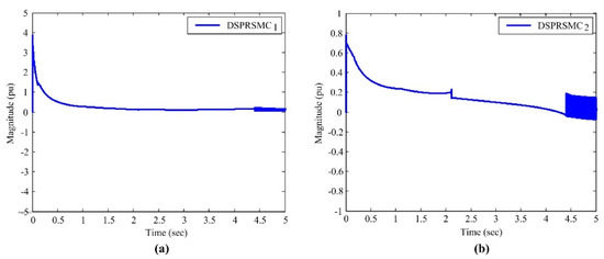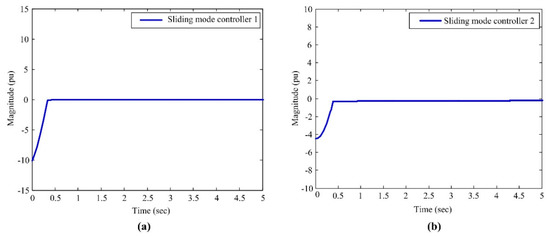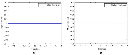 There are many approaches for reducing the chattering phenomenon such as using a sign or tanh function [32,33], the boundary layer method [34]. However, these approaches affect the accuracy and robustness of the system. In this section, by using the Barbalat’s lemma, the proposed chattering free single-phase sliding mode controller (Equation (24)) offers the major advantage that the chattering in control input is completely rejected, the system’s state trajectories always start from the sliding surface, and the robustness of the system is ensured. Therefore, the designed controller (Equation (24)) is very worthwhile and more realistic, since it can be implemented in many practical control systems.