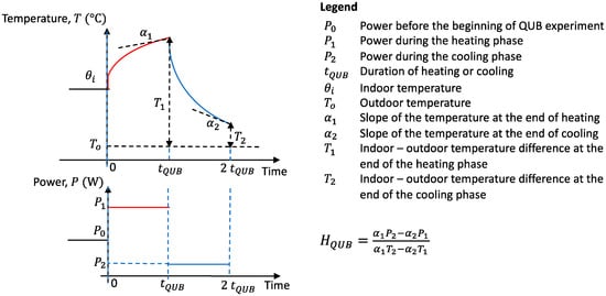 QUB (quick U-value of buildings) is a short time dynamic method, originally developed by Saint-Gobain, that can determine the heat transfer coefficient value in one to two nights []. This method involves application of power in the form of a positive step input after sunset followed by no power during the night (Figure 1).