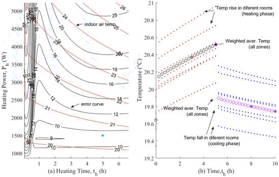 Design of the QUB experiment: (a) heating power and time duration: error curves of the overall heat loss coefficient (black) and internal temperature (red); the blue star shows the error when the experiment is performed at 1500 W and 5 h duration for the each phase of the QUB experiment and (b) the exponential response of seven zones of the house for 1500 W and 5 h: fall of temperature during the two stages of QUB experiments (dotted line), weighted average temperature rise during heating (the black circles) and weighted average temperature fall during cooling (pink).