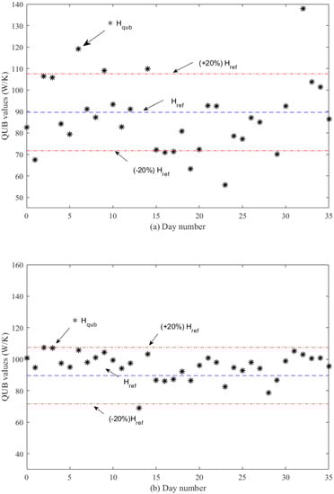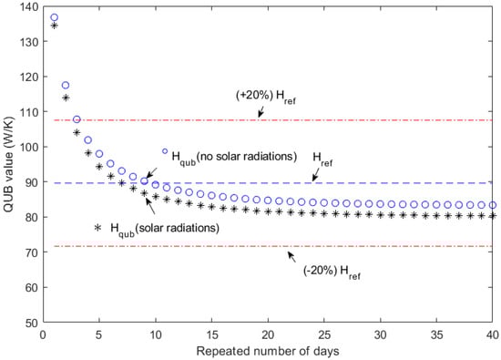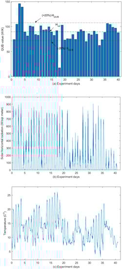 Figure 4a shows the values of the overall heat loss coefficient, , obtained by numerical QUB experiments and the exact value of the overall heat coefficient, , obtained from the mathematical model []. Weather conditions during the experiments are given in Figure 4b,c. The majority of the values of the overall heat coefficients were within ±20% of the reference steady state overall heat loss coefficient. The outliers in Figure 4a coincided with extremely small power ratios (alpha value in Equation (4)). Alpha value should be in the range of 0.4–0.7 []. The day 18 of the QUB experiment shows a positive slope during the cooling phase, meaning that temperature increased instead of decreasing. These cases were considered outliers and were removed as they correspond to ‘bad’ designs of experiment and/or to external climatic conditions, which need to be disregarded.