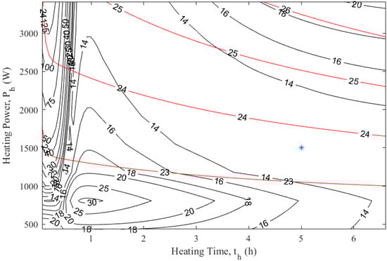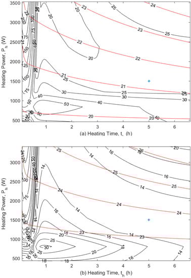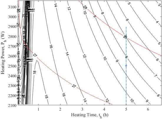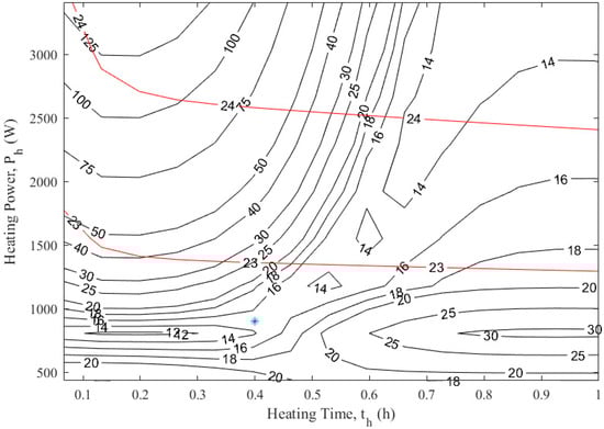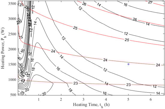 As a first step, a QUB experiment was performed with constant outdoor temperature and no solar radiation before the start of the experiment for which different levels of power and time duration were used. The error contour plot for the house was similar to those obtained previously in literature []. It shows that QUB error was predictable at given power and time (Figure 3a).