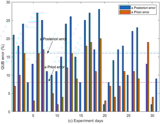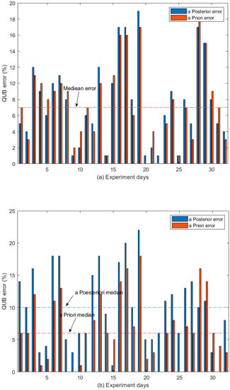 For the cases discussed above, the a priori error is defined as the error when the real -value was used for designing the experiment, whereas the a posteriori error is defined as the error when a supposed -value (obtained, for example from building specifications), which is different of the real -value, was used for designing the experiment. Figure 18 shows the results of 32 QUB experiments conducted on different days. The results show that when  error of -value was used in the design of the experiment (Figure 18a), the increase in a posteriori error was not significant (shown by the blue bar slightly higher than the red bar).