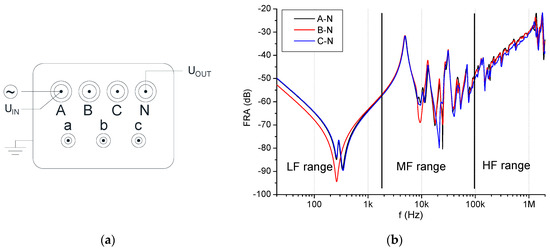 The frequency response analysis method is based on a comparison of a sine signal applied to one end of the tested object to its response recorded at the other end. The measuring technology is already standardised [11,12], so it is possible to perform repeatable measurements. There are several test configurations, however, the standard [11] recommends using an end-to-end test connection, where the input signal is given at the beginning of the tested winding (given phase and voltage side of a transformer), the reference channel measures the signal at the same place (to remove the influence of test cables), while the second channel measures the response at the end of the winding. For Y-connected windings, the connection is A-N, B-N, C-N, while for delta connected windings it will be A-B, B-C, C-A. The remaining bushings are left open. A graphical presentation of the test circuit is given in Figure 1a. All the results provided in this paper were recorded in this test configuration. There are some important details about the measuring technology, such as a proper connection to the bushings, tap changer positions, and the correct grounding of cable screens, which should be taken into consideration, but are not the topic of this paper, so will not be discussed in detail [13,14,15].