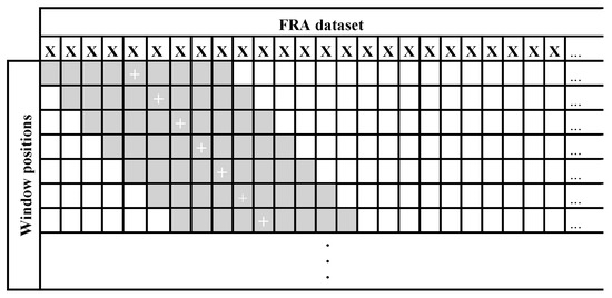 The process of the FRQI calculation, altogether with its components, is similar to the finite impulse response filter operation [26]. The data stream is subjected to successive calculations with the application of a window, which considers N = 2∙K + 1 of subsequent elements of data vector (FRA values). The window is shifted along the input vector by one element, and as a result of calculations, the vector of the output values is created. This contains 2∙K elements less than the input vector. The process of every value calculation from the values present in Equations (2)–(4) (estimate of covariance, variance, and expected value) is shown in Figure 2. The approach based on application of a sliding window of the FRA data stream was described in [27], where one of the standard numerical indices was assessed: cross-correlation factor (CCF) and its modified version.