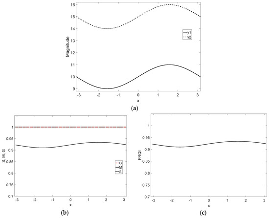 In case 1, for two curves y1 and y2, which differ only by a horizontal shift, significant changes can be observed in indices S (x) and G (x), while the index M (x) is almost constant. Eventually, if Equation (1) is considered, the FRQI (x) index changes its values, as shown in Figure 3e. The mean values calculated for all indices and for −π ≤ x ≤ π are: S = 0.324, M = 0.998, G = 0.666, FRQI = 0.259.