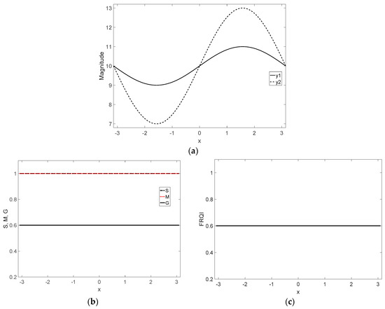 Case 2, presented in Figure 4, is a vertical shift of identical curves. As a result of calculations, no change in the values of the S and G indices was observed (S (x) = 1 and G (x) = 1). The final values for FRQI are influenced only by the M index, which can be clearly seen if curves M (x) from Figure 4b and FRQI (x) from Figure 4c are compared. For the analysed case 2, the mean values of each index for −π ≤ x ≤ π are: S = 1.000, M = 0.922, G = 1.000, FRQI = 0.922.