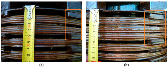 Deformations introduced into the winding of transformer No. 3: (a) one disc lowered for deformation 1; (b) two discs lowered for deformation 2. The rectangles on pictures point to places with removed spacers.