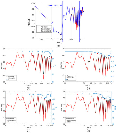 The full frequency spectrum is presented in Figure 9a. The LF range of its FR is not influenced by deformations in a significant way. In the MF range, differences start from approximately 100 kHz and result mainly in damping changes of the resonance points only. Such an effect is related to the FRQI factor changes of resonances followed by local changes of capacitances and mutual inductances, which are caused by disc shifts in the winding. The HF range is also slightly influenced in a similar way. Figure 9b–e present the analysis with the FRQI components.