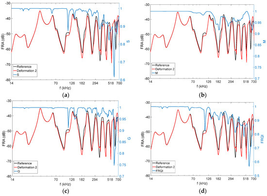 In this case (deformation from Figure 8a), the S index changes its values to a much lower extent, which is expected, as the differences between two analysed curves are also much smaller than for previous transformers. The M index detects differences in the range where they appear—from approximately 200 kHz, which also is a good tendency. The third parameter G also indicates mainly the range of the biggest changes between the FR curves. The total FRQI graph is directly connected with the suspicious frequency range and allows for detection of the introduced changes. The average values of the three component indices do not change significantly (S = 0.994, M = 0.990, G = 0.996), which also influences small changes to FRQI = 0.980. Therefore, the analysis should be performed not only for the single values of all parameters, but also as their values change along the frequency (changes below 0.9 for S).