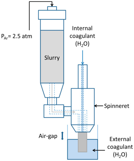 A powdered BSCFM10 precursor was synthesized by a convenient solid-state reaction. BSCFM10 HFMs were produced by a phase inversion technique. The ceramic precursor was mixed with an N-methyl-2-pyrrolidone solvent (NMP) and a polysulfone binder (PSU) in a ratio of 10:4:1, respectively [6,7,8]. The slurry was homogenized and degassed by using a Dispermat® LC-55 (VMA-Getzmann, Germany) over 120 min at 1500 rpm. The slurry was extruded through a spinneret (Figure 1) to make the green bodies of the HFMs. The air gap was 10 mm.